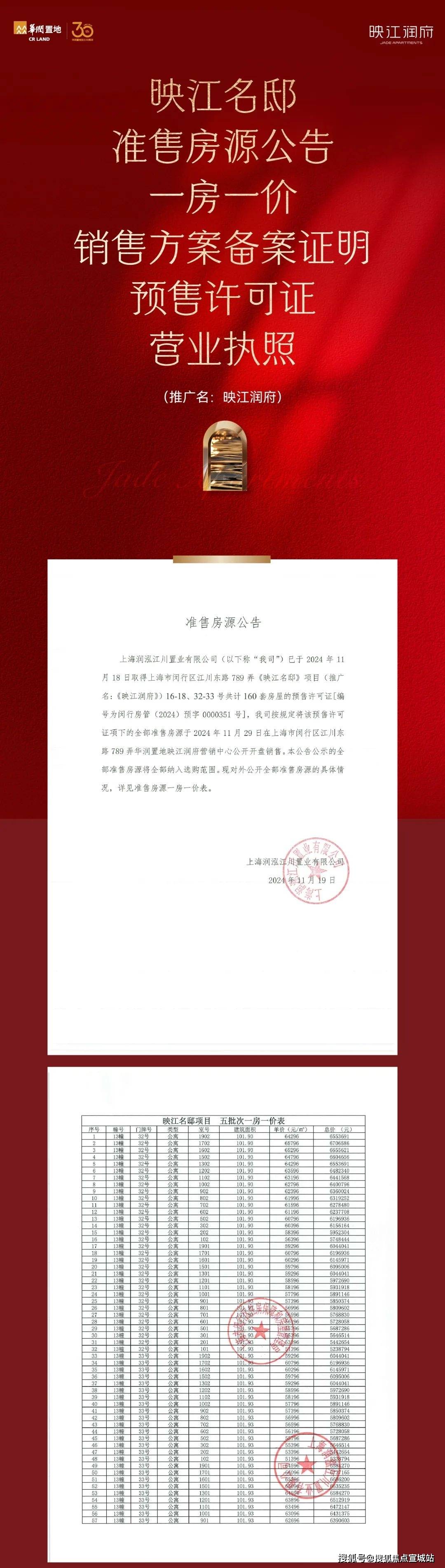 本资料为要约邀请,不作为要约或承诺,项目具体信息以政府最终审批文件为准; 项目周围环境、交通及其他公共设施的效果示意以实际落成或政府部门标准文件为准。 有关学区划分根据政府部门当年的划分为准,不作 为开发商的任何承诺。 相关宣传内容不排除因政府规划、规定及分期规划、未能控制等原因发生变化,在不违反法律法规、合同约定前提下,本公司有权对该宣传资料细节进行调整或更新。 预售证号: 闵行房管(2024)预字0000120号、闵行房管(2024)预字0000164号、闵行房管(2024)预字0000232号、闵行房管(2024)预字0000269号、闵行房管(2024)预字0000351号。 制作日期: 2024年11月19日。 开发商: 上海润泓江川置业有限公司; 备案名: 映江名邸 ; 营销推广名: 映江润府